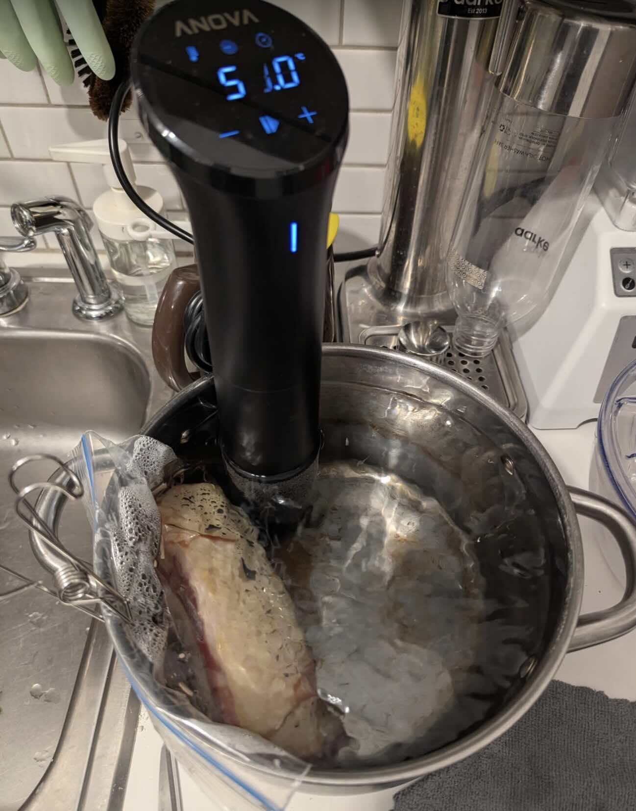 First, I set Anova precision cooker at 58C (136F) degrees and leave the duck at the temperature for 3 hours. Duck should be put in a ziploc bag.